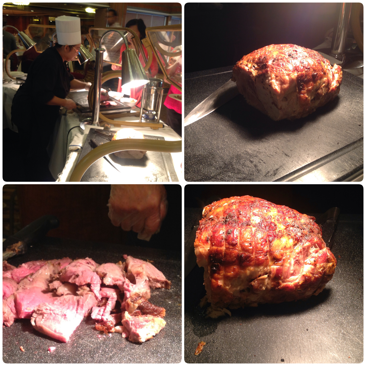I think that one of my favorite stations at the Queen Mary brunch was the meat carving station. They had Prime Rib with Au Jus, Carved Spiral Cut Honey Baked Ham and Turkey With Gravy. The meat carver gave you as much or as little as you wanted and then you topped your own meat if there was a gravy/Au Jus available. I think every single plate I got had some sort of hand carved meat on it.