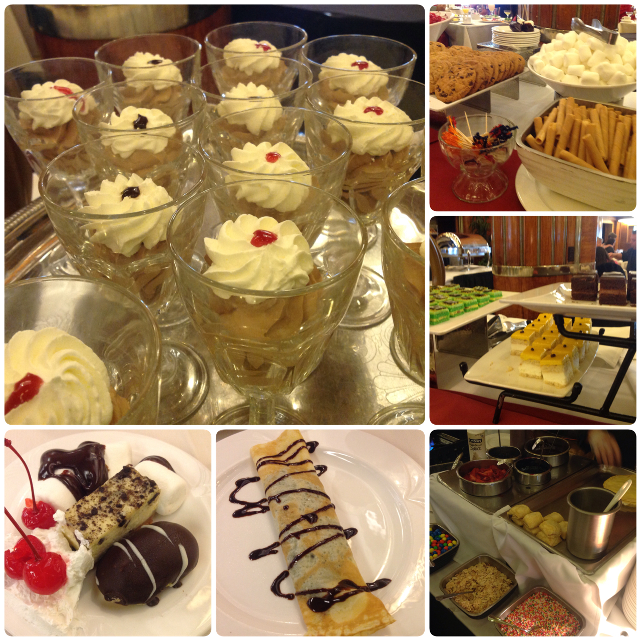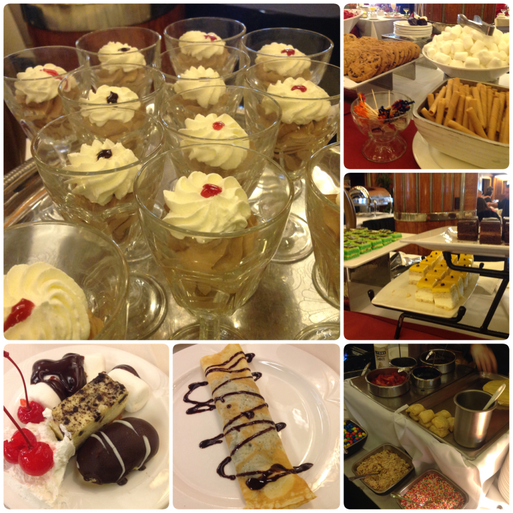 Oh and the Queen Mary does not forget about the kids! Their kids spread is every childs dream! Chicken Nuggets, Pizza, Grilled Cheese…and of course I tried them! They were delicious and perfect for every kid. And last but not least is the dessert station. By the time we got to dessert I felt like I was going to explode but there was no way I was missing dessert! I tried a little bit of everything including Petite eclaires, Mini Filled Cupcakes and an Ice Cream bar!