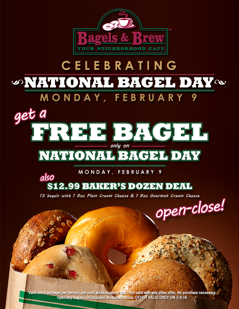 Food and Drink News FREE Bagel for National Bagel Day at Bagels and Brew February 7, 2015 Eatdrinkoc Don’t miss out on your FREE bagel on National Bagel Day! Bagels and Brew neighborhood Cafe will be offering a free gourmet bagel to each guest on Monday February 9th with no purchase necessary. Share this: Click to share on Facebook (Opens in new window) Facebook Click to share on X (Opens in new window) X Click to share on Pinterest (Opens in new window) Pinterest Click to share on LinkedIn (Opens in new window) LinkedIn Click to share on Reddit (Opens in new window) Reddit Click to print (Opens in new window) Print Click to email a link to a friend (Opens in new window) Email Related