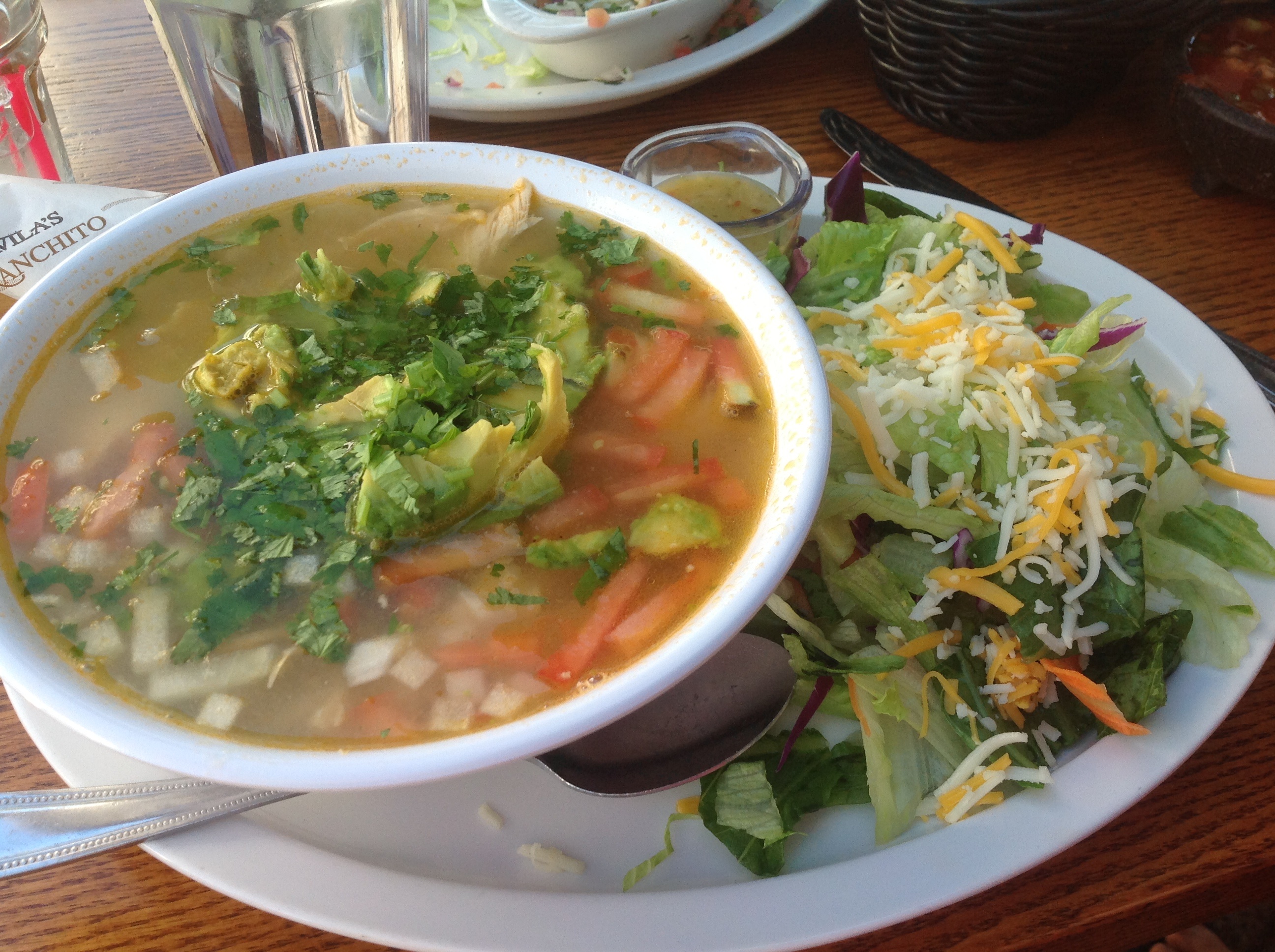 For my main entree I ordered Mama Avila’s Soup and salad. All I can say is WOW! This soup was amazing. It was a large bowl of chicken breast and rice soup, garnished with fresh avocado, cilantro, onions and tomatoes. Served with warm tortillas. There was so much pulled chicken in this soup it was delicious! The salad was also delicious. The lettuce was crisp and came with cabbage, carrots, tomatoes, black beans, corn and peppers.