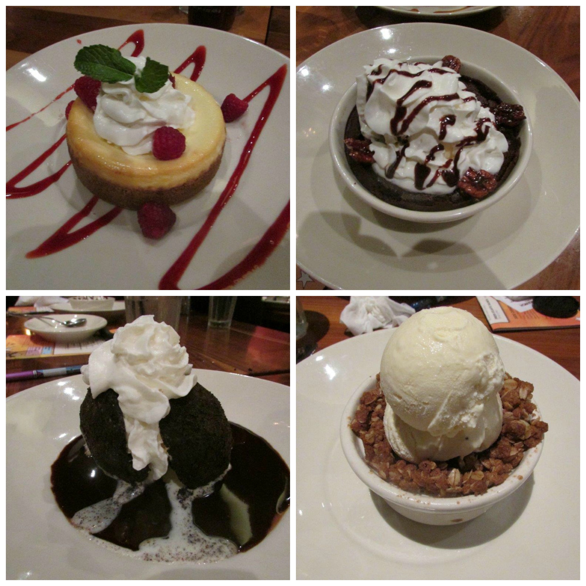 As if that weren’t enough we had to leave room for dessert. We tasted 4 different desserts: A Warm Chocolate Cake, Mom’s Deep-Dish Cobbler, The Best Cheesecake, and an Oreo Cookie Crunch. The chocolate cake came with vanilla ice cream, whipped cream, hand-candied pecans.