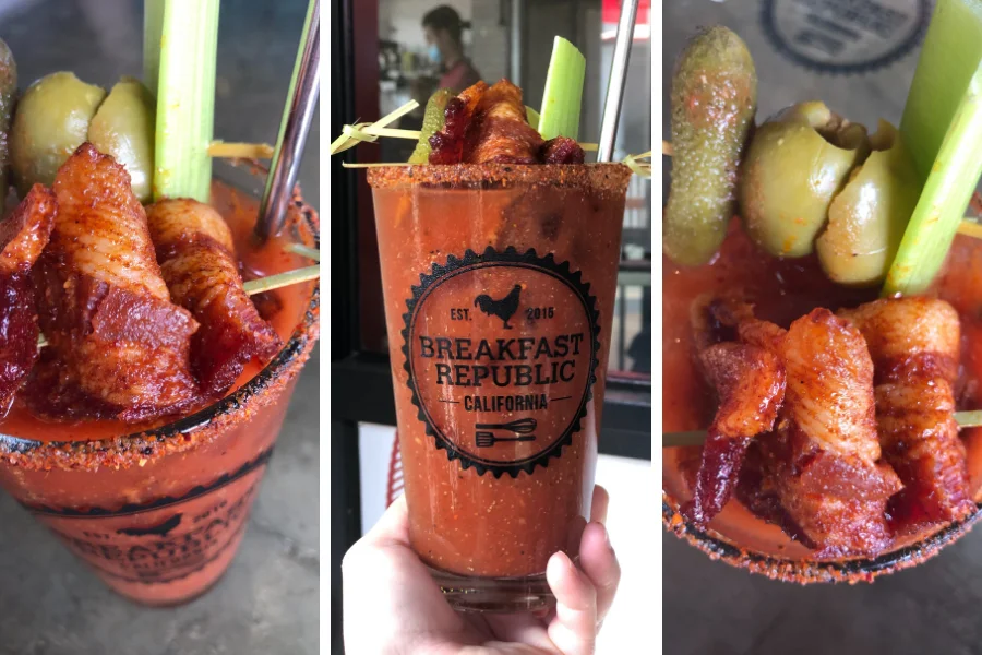 For those looking to enjoy a morning cocktail Breakfast Republic offers craft beer and organic kombucha on draft, which are available as samplers to complement many of the unique dishes they serve. On a recent visit to the Mission Valley location I tried their Jurassic bloody Mary with candied bacon and a tajin rim. It was stuffed with pickles, celery, olives and best of all came with a stainless steel straw!! Honestly this drink was a meal in itself. All of their drinks come in witty glasses and cups.