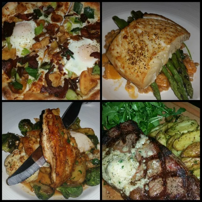 We got try the Hearth Roasted Halibut (yep it’s cooked on a cedar plank in the pizza oven) with butternut squash Farro and grilled asparagus. The Roasted Garlic Chicken with fingerling potatoes and rosted brussel sprouts and cauliflower. The Sunnyside up Bacon and Potato pizza and then the piece of resistance. No it wasn’t the lid to the Krazy Glue! YOU GUYS!!!!! THE RIB EYE STEAK IS TO DIE FOR!! It’s the Fire Grilled Rib Eye with Blue Cheese butter, roasted fingerling potatoes and lemon garlic arugula. This dish I believe is my new go to dish. It was so good I dreamed about it that night.