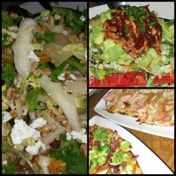 Now normally when I go to California Pizza Kitchen I get the BBQ Chicken Chopped Salad and the Avocado Egg Rolls. Today though, since this was a media event I got to try a whole bunch of new items that I normally would never had tried. I got to try the new Harvest Kale Salad, the Brussels and Bacon Flatbread and the Smoked Ham and Swiss Flatbread. And hen because I had mentioned that I loved the BBQ Chicken Chopped they brought one of those as well. Still my favorite but I am beginning to see some signs that I might not order it every time now.