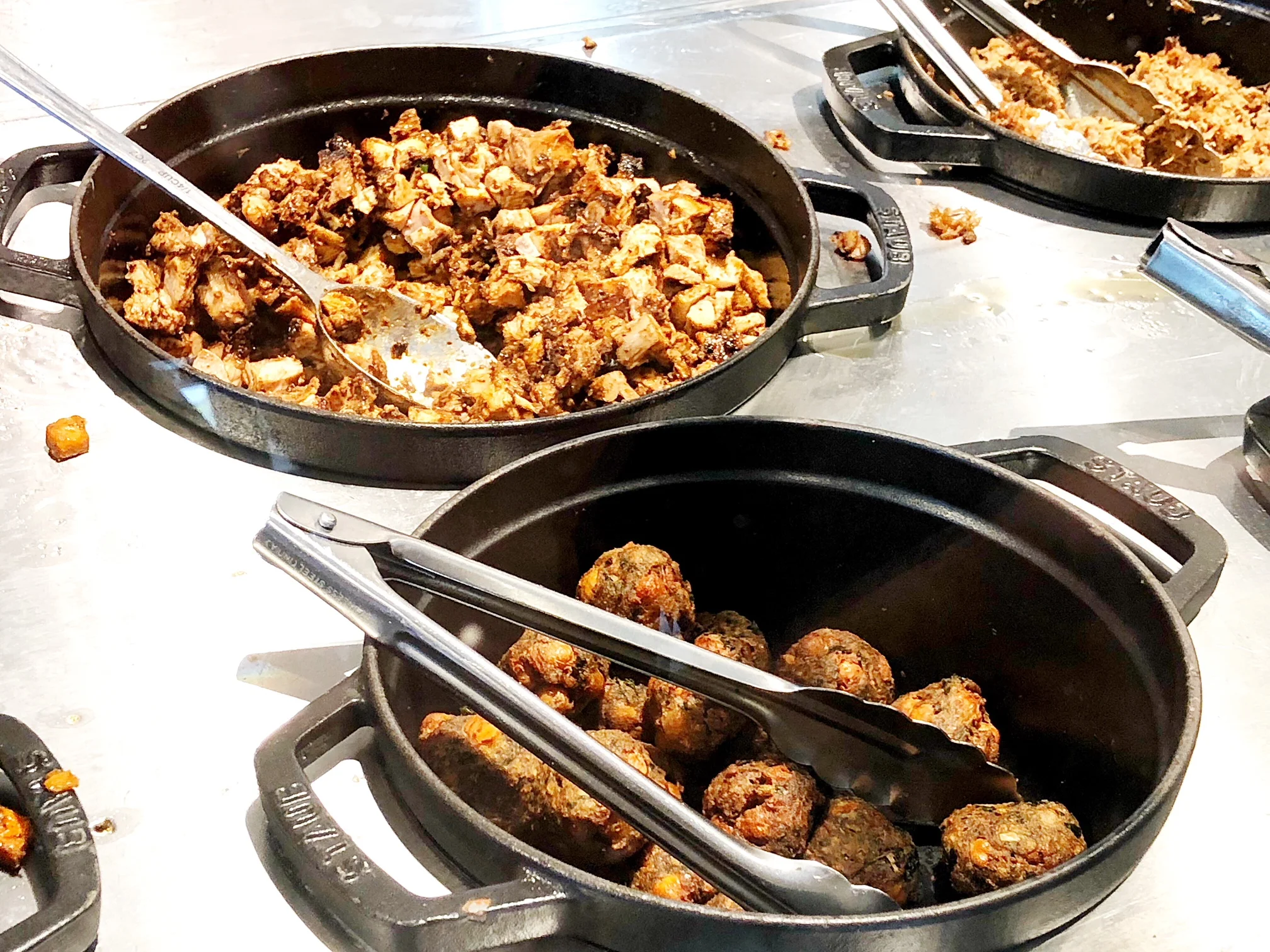 The concept is easy! You start at the beginning of the line and pick your base. Either salad, a grain bowl, salad + grains together, or pita. Then you choose your dips: Eggplant/Red Pepper dip, hummus, Tzatziki, Harissa, crazy feta or roasted red pepper hummus. Finally, you choose your protein: Falafel, ground chicken, spicy lamb meatballs, grilled meatballs, braised beef, braised lamb or roasted seasonal vegetables. Finish all that goodness off with some yummy toppings: shredded romaine, tomato/onion salad, pickled onions, kalamata olives, cabbage slaw, tabbouleh, tomato cucumber salad, diced cucumber, pita crisps, lemon wedge, mint, crumbled feta, pickled banana peppers, or a white bean salad.