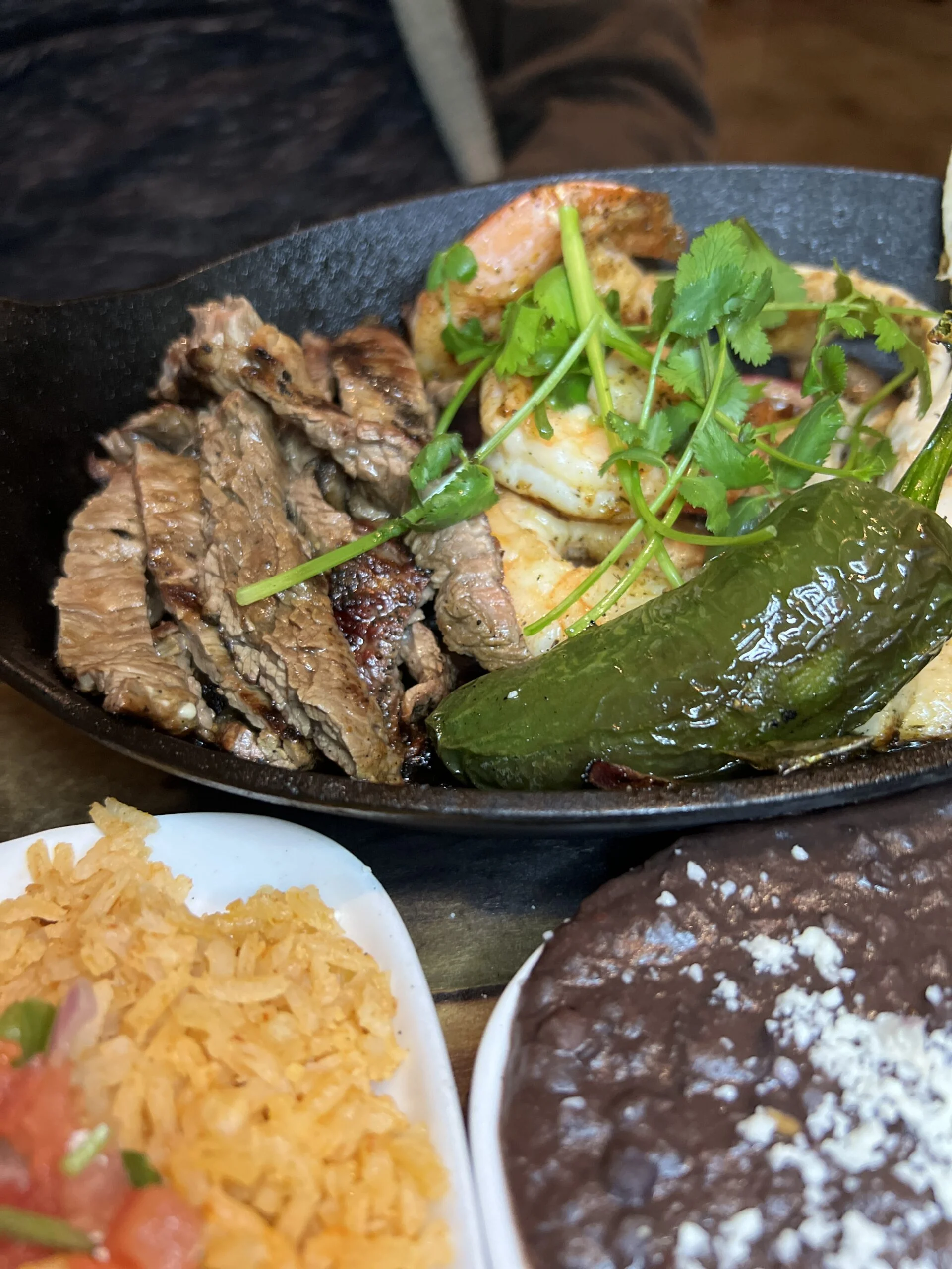Next up were our main dishes. We order the chefs sizzling fajitas and wow is this dish aesthetically pleasing to the eye! it comes out sizzling with Jumbo shrimp, chicken and carne asada, on a bed of peppers and onions, served with rice and beans. Choose flour or corn tortillas. The portion size was huge and we took half of it home.