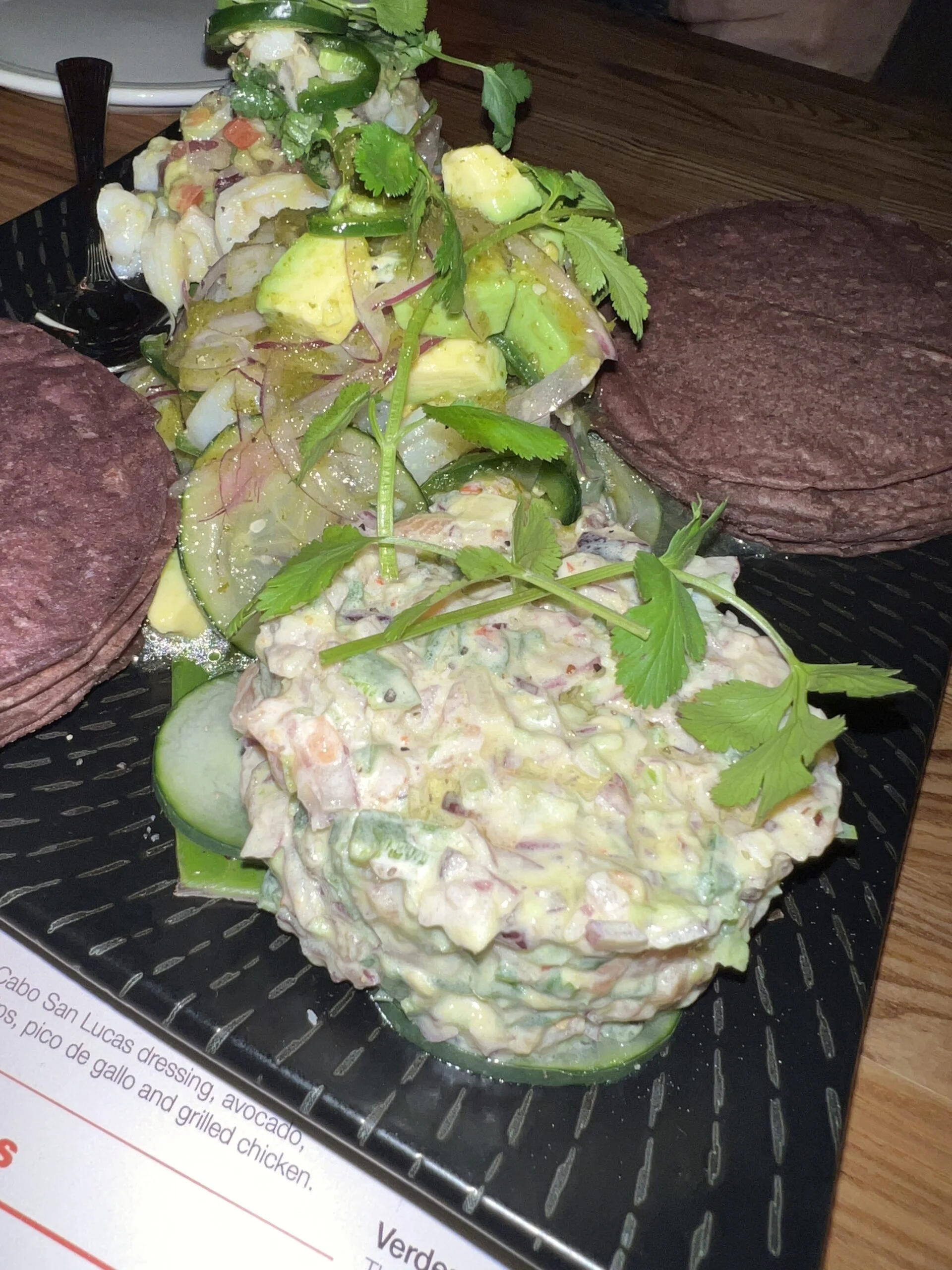 I was thoroughly impressed with the dinner menu as it is significantly larger than the lunch menu. I had the option of choosing a variety of Mexican dishes that had me drooling as I read each one. We started off with the appetizer called “Trio Dewl Mar”. It had salmon tartare, ceviche, and aguachiles de Lobster. Holy Moly it was delicious and had so many flavor profiles. It comes with these crispy mini blue tortillas that serve as a vessel to your mouth. This dish was so fresh and was served chilled. The cucumbers give it that extra crunch if you are not using the tortillas.