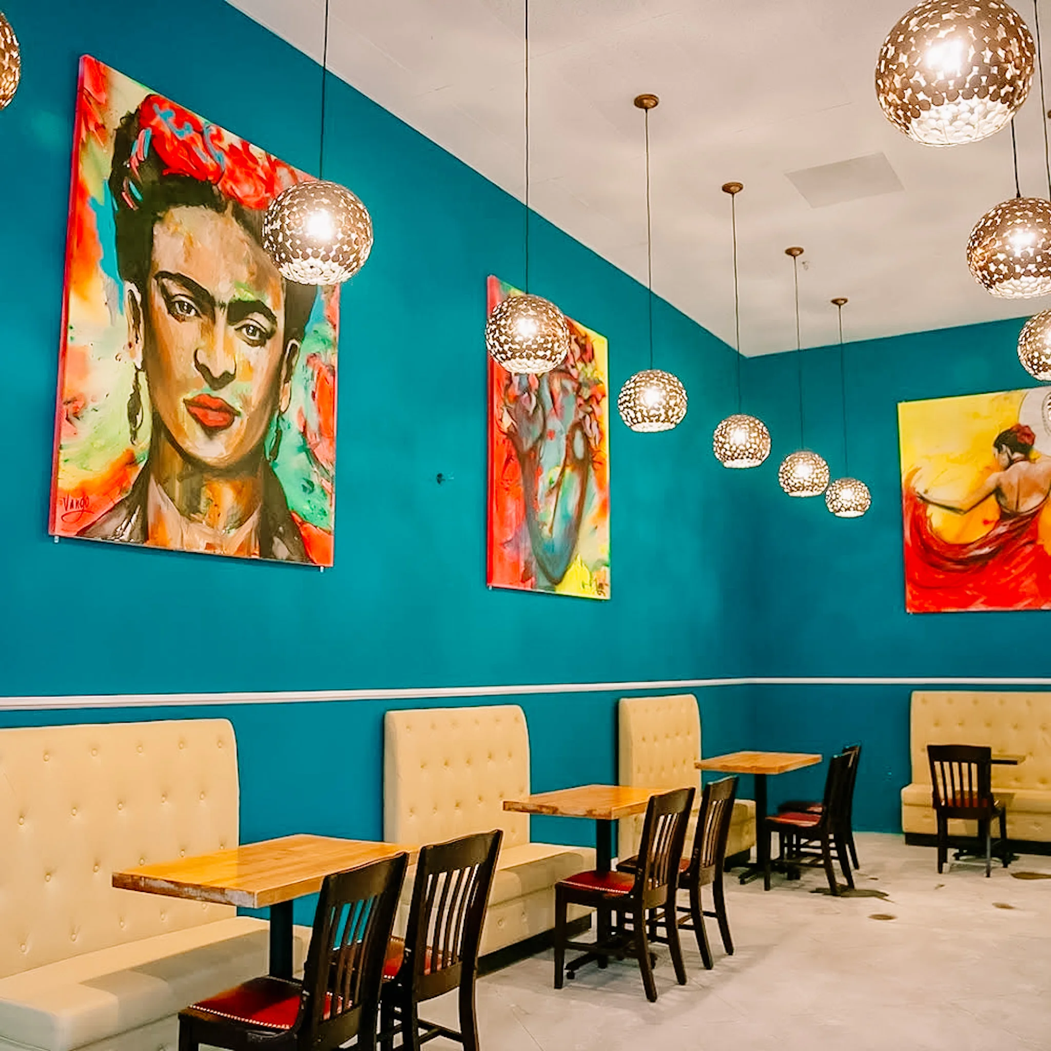 The first thing that catches your attention in this restaurant is the eccentric artwork of Frieda Kahlo. Lots of large canvas paintings full of vibrant colors and emotion. Even the walls of the restaurant have loads of personality and give great contrast to the comfortable furniture throughout the space. The lighting was modern and ample.