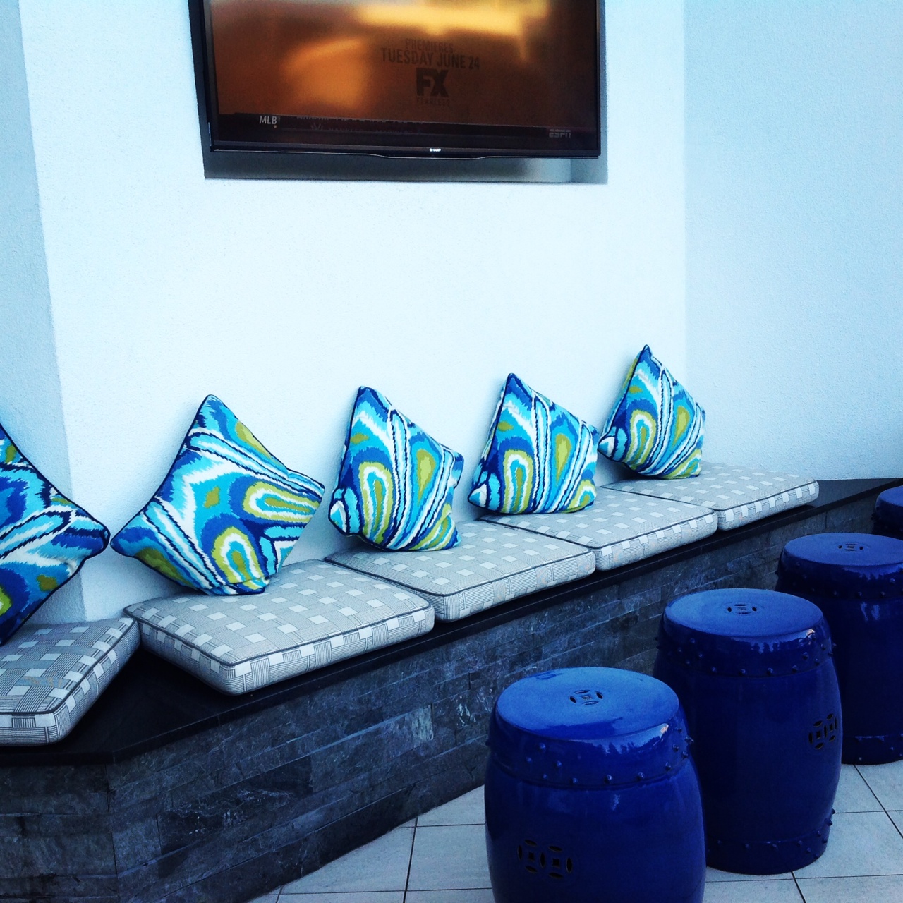 There is also a beautiful seating area with vibrant blue pillows, a TV and some tables/ottomans. They even have blankets for you if you get cold!