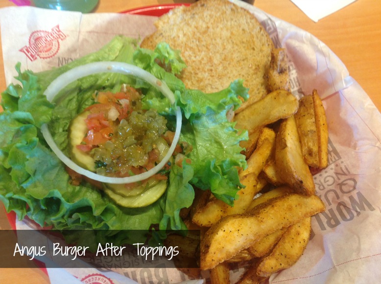 I ordered a 1/3 pound angus burger with fries. After my order was handed to me I went over to the topping station to jazz up my burger. They had all of my favorites. Pickles, tomatoes, relish, shredded lettuce, whole leaf lettuce, onions, peppers, and pico de gallo.
