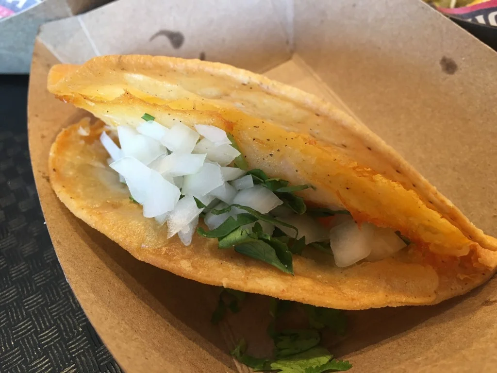My favorite taco of the bunch was this awesome potato taco. It comes in a crispy shell and it’s stuffed with tender , piping hot potatoes. I also added onion and cilantro. Holy moly I think my eyes rolled into the back of my head when I took a bite. I am officially obsessed.