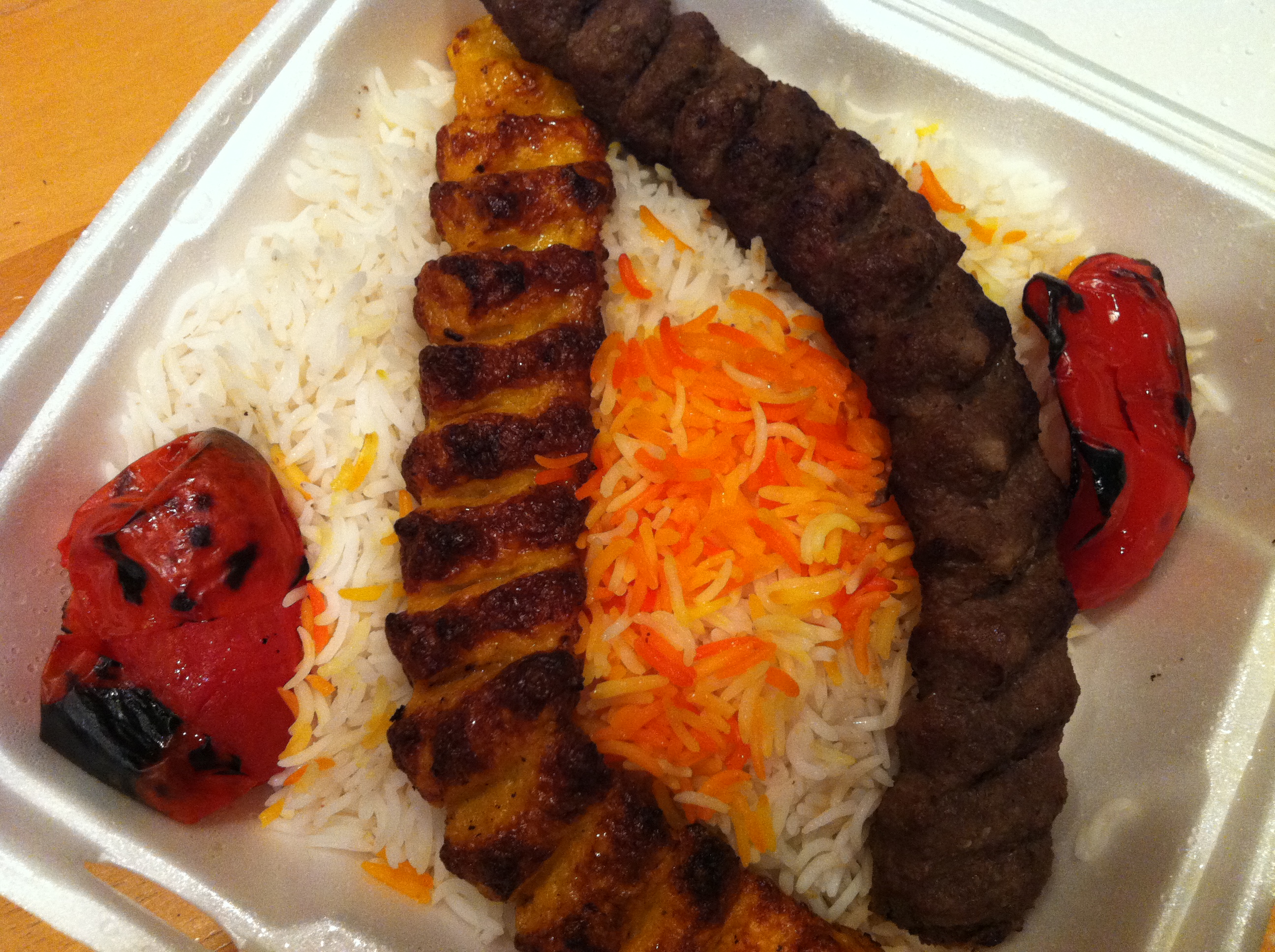 The Koobideh /Chicken Combo is served with charbroiled tomato, Basmati rice, and saffron, The meat is so tender and juicy and it practically melts in your mouth. This is enough food for two people to share. If you dine in they will serve it on a regular plate and not in a Styrofoam box as shown.