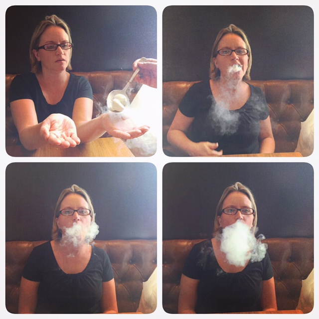 This was probably the best part of a our meal. The manager came by with a bowl full of merengue cookies that are cooked in Liquid Nitrogen. We each took one and tossed it around in our hands for a bit. Then we popped them in our mouths and that is when the magic happened. The smoke comes out of your mouth and nose and you can’t help but laugh because it’s such a funny effect. The cookies actually taste really good and super fresh!