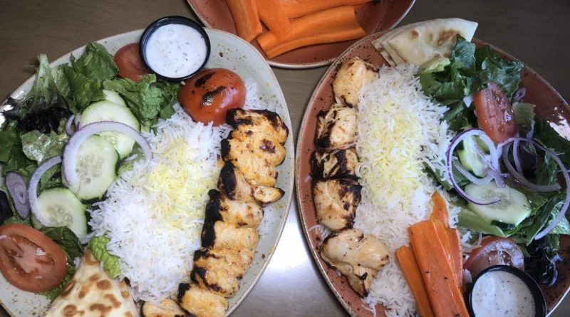The signature chicken and veggie kabobs are cooked over an open fire and served with organic original or spicy humus and rice. The Chicken Kabob is stacked with succulent pieces of boneless chicken tenders. The Vegetable kabob is stacked with mushrooms, squash, onion and bell peppers. Both delicious, both very filling.