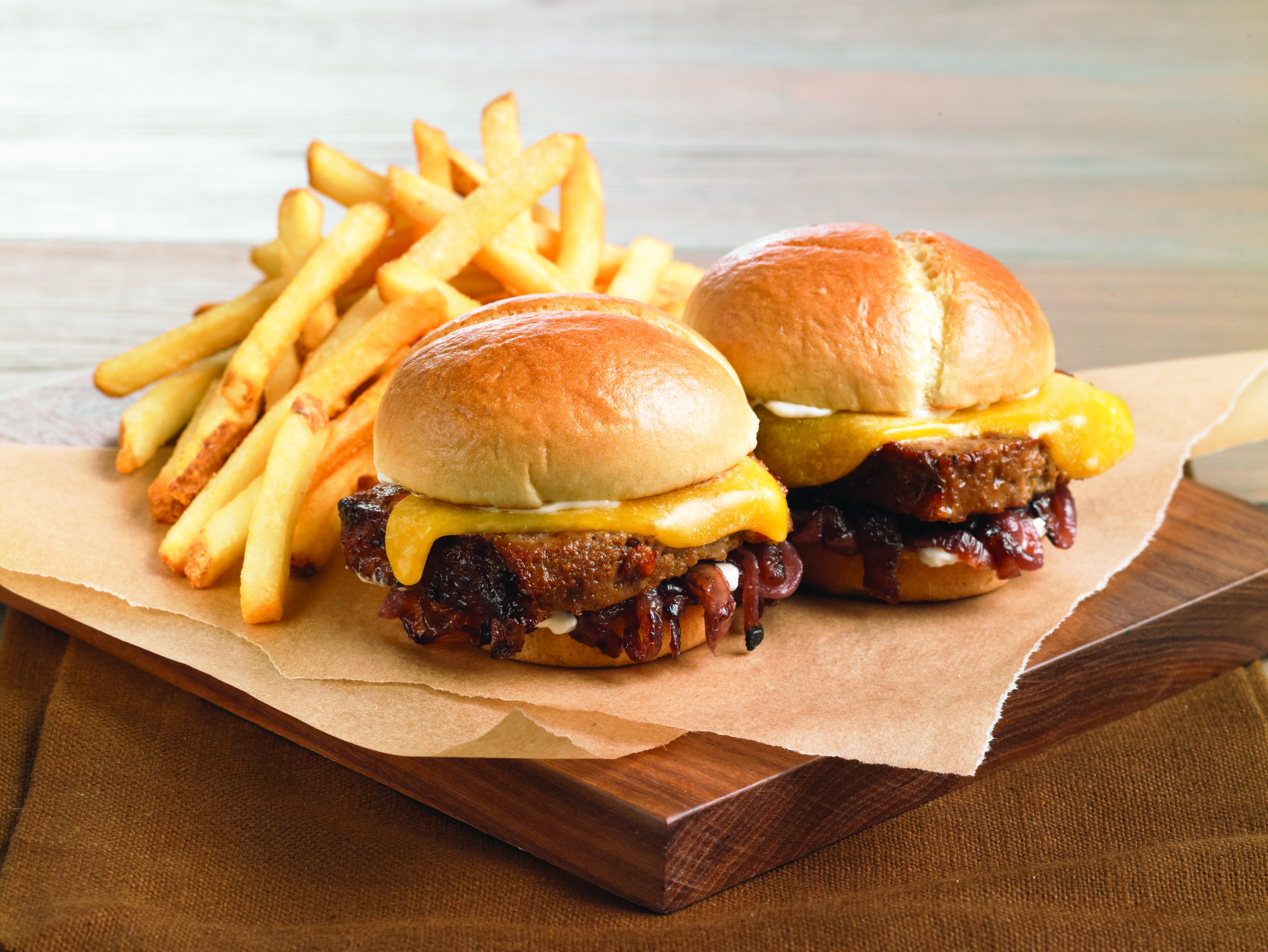 - Meatloaf Sliders – Two sliders stacked with home-style meatloaf, port caramelized onions and sharp cheddar cheese