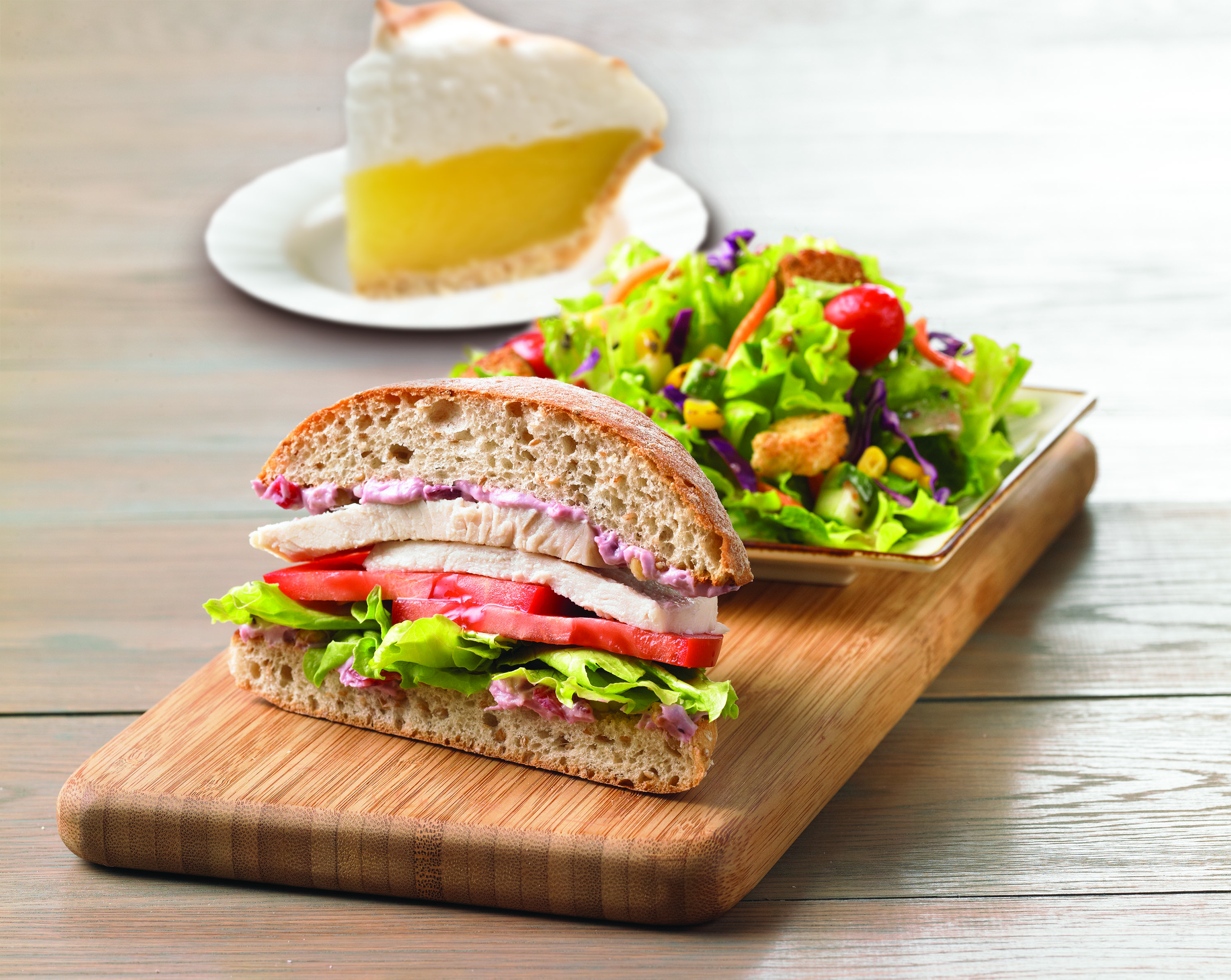 - Half Chicken Waldorf Salad Sandwich – Chicken Waldorf salad made with fresh apples, cranberries, caramelized pecans and raisins topped with lettuce and tomato on a wheat ciabatta