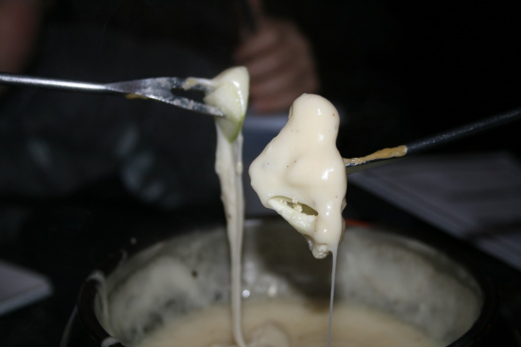 To start with we tried the melted cheddar cheese as well as the swiss cheese fondue . Sydney heated up our bowls and placed them on the burners and we watched our cheese turn into an ooey gooey melty delicious soup. We had bread cubes, apple slices, cauliflower, broccoli, and mushrooms to dip.