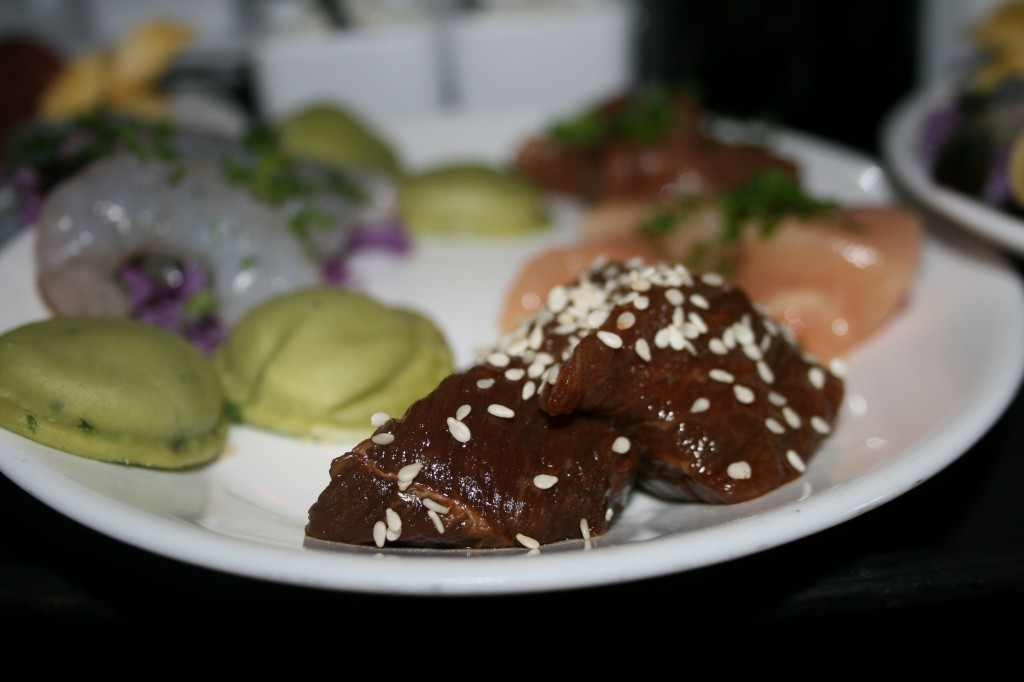Speaking of broth I chose the Bourguignonne borth. A European-style fondue in cholesterol-free / 0g trans-fat canola oil. Served with tempura and sesame batters. I absolutely loved this. It was rich and flavorful and it was perfect for both meat and vegetables. Even my shrimp tasted good in it. My husband kids had the seasoned court Boullion which was a fresh seasoned vegetable broth.