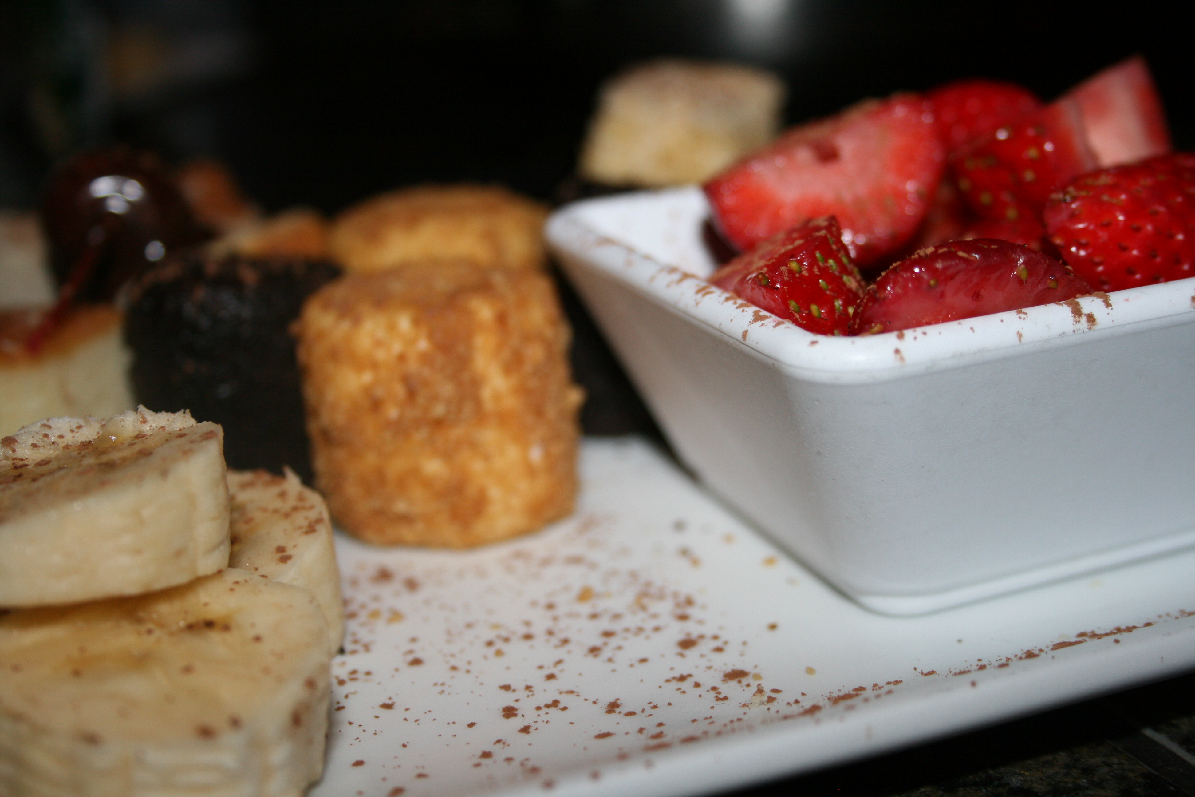For dipping, we had strawberries, coconut marshmallows, chocolate marshmallows.sliced bananas, brownie bites, and cheesecake bites. My kids were in heaven!