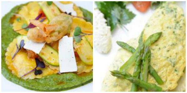 - Zucchini Blossom and Goat Cheese Ravioli with zucchini emulsion, tomato confit, crispy zucchini blossoms with parmesan and shaved ricotta salata