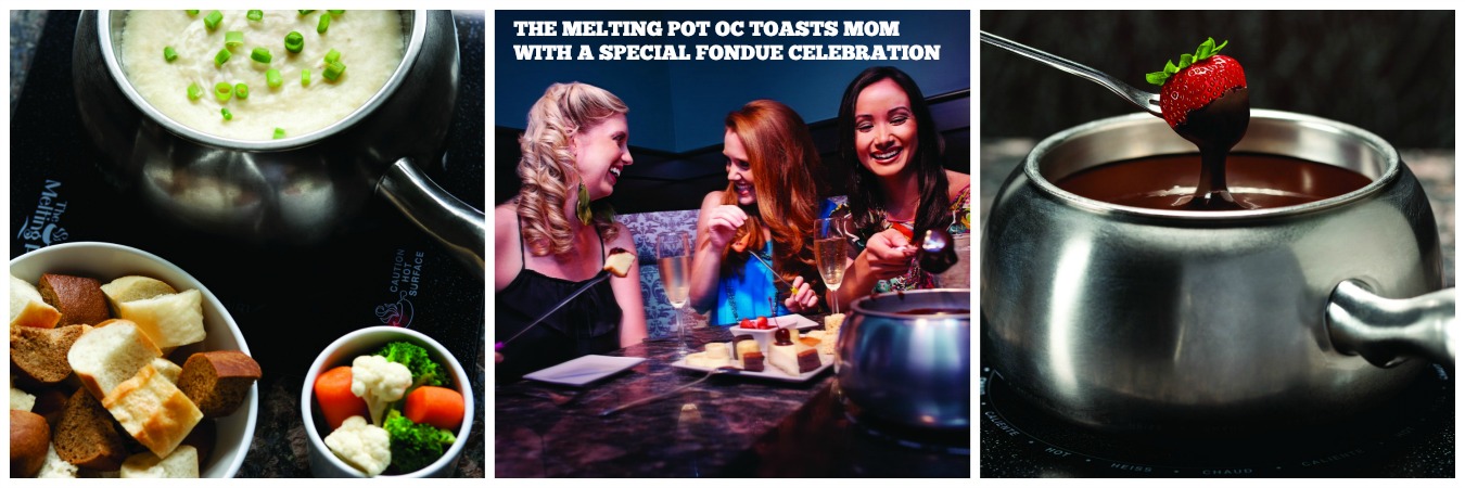 Guests will begin their savory and sweet Mother’s Day experience with a creamy and delicious cheese fondue, zesty salad, fresh and seasoned entrée and rounded out with a decadent chocolate fondue dessert. To sweeten her experience at The Melting Pot, mom will also receive a complimentary box of signature chocolate dipped strawberries! Mother’s Day menu prices range from $43.95 to $48.95 per person. Reservations are recommended before May 8th, 2014t.The Melting Pot has two locations in Orange County: The Melting Pot Brea, located at 375 W. Birch Street, (714) 671-6000; and The Melting Pot Irvine, located at 2646 Dupont Dr., (949) 955-3242.