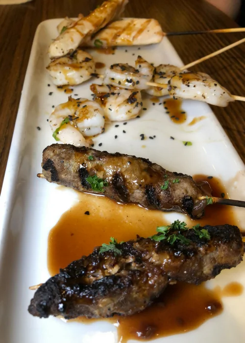 Next up were appetizers. We enjoyed Brochette Trio which comes with two skewers of grilled chicken, shrimp and beef topped with spicy peanut, teriyaki and red wine sauces. Surprisingly it is only 650 Cal.
