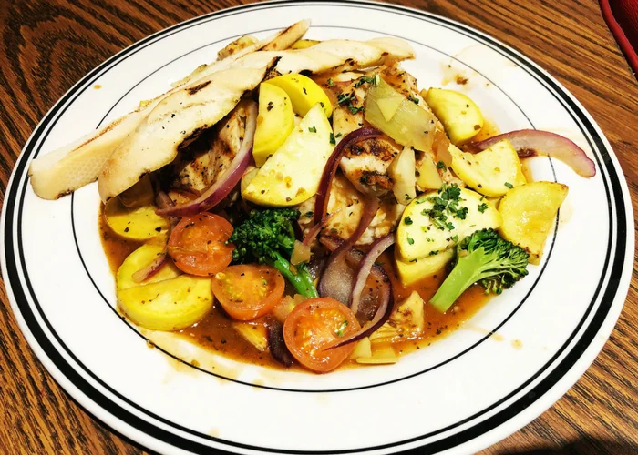 The Tuscan Style Grilled Chicken is also a great protein rich entree and has a lot of vegetables. Grilled chicken breast, mashed potatoes, sautéed vegetables and artichokes comeplete this meal with a side of garlic bread.