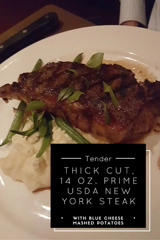 This center cut slice of tender beef deliciousness came perfectly flavored and precisely cooked to my husband’s liking. At least one or two times I caught him with his eyes rolled to the back of his head as he savored the juicy tenderness of each bite. Though potato and gruyere gratin came with the steak on the menu, my husband opted for the Bleu cheese mashed potatoes instead. No offense to the potato and gruyere gratin at all – prior to our visit he checked out the menu online and had set his sights on the Bleu cheese mashed potatoes. From there, it was love at first sight. And yes, I am secure enough in our relationship to have allowed the love affair to continue.