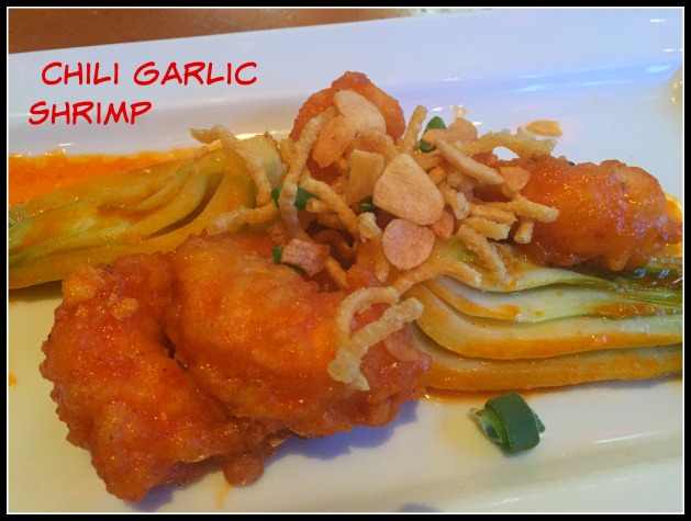 For appetizers try the, the Chili Garlic Shrimp. It is light yet crispy and has the pungeant flavor of chili. Sautéed garlic, bok choy, scallions, crunchy garlic chips and crispy ramen noodles give this dish an excellent crunch and unique flavor.