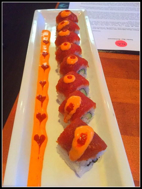 For rolls you have to sample the Red Heart Roll. This georgeous masterpiece has crab mix, fresh avocado and cucumber rolled and topped with crispy spicy tuna, spicy mayo and Sriracha. You will love the red hearts created by the chef.