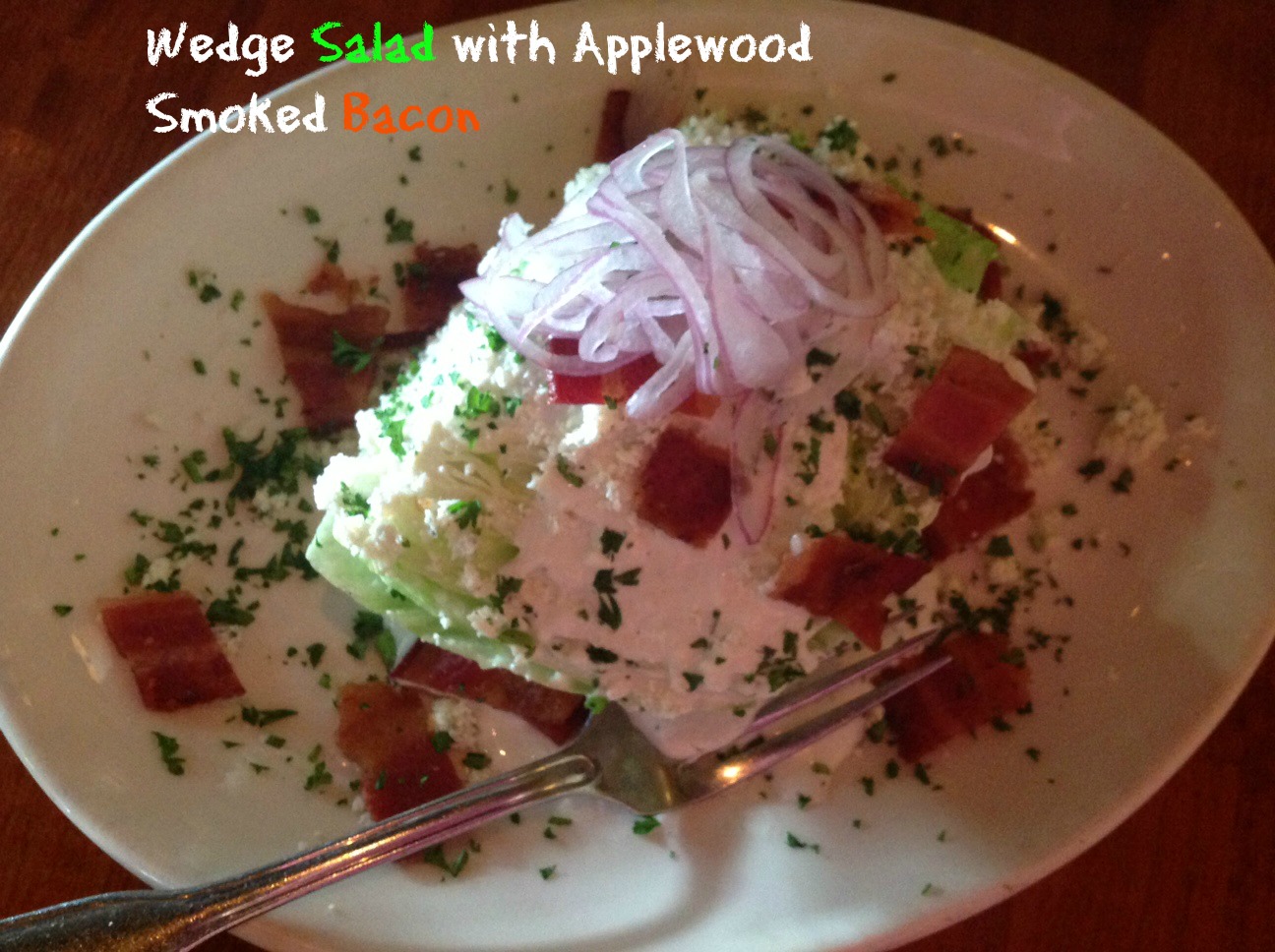 Erin ordered the Wedge Salad and it came with iceberg lettuce, sweet onions, gorgonzola, and applewood smoked bacon. Then they drizzle blue cheese dressing on top.. It was crisp and flavorful.