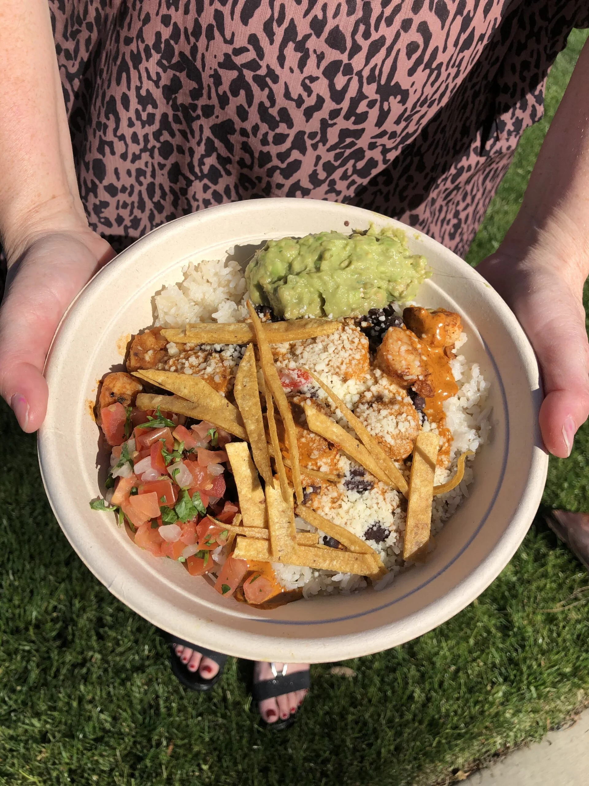 - Smoky Oaxacan Shrimp Bowl – Smoky Oaxacan marinated grilled shrimp, guacamole, cotija cheese, cilantro onion mix, cabbage and a smoky Oaxacan sauce on warm stone-ground corn tortillas. Served with black beans and tortilla chips.
