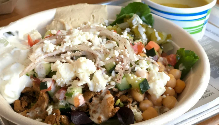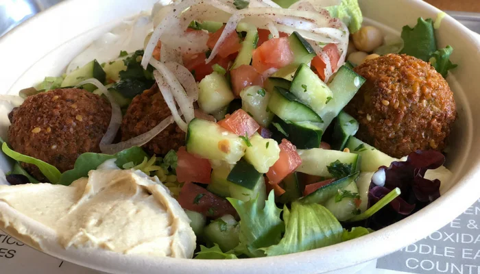 On a recent visit with a friend, we ordered a falafel bowl and a chicken shwarma bowl, piled high with lettuce, shirazi salad, garbanzo beans and hummus! It was light, filling and nutritious. Make sure you also order the homemade pita chips – They are incredible. My friend and I each ordered our own because neither of us wanted to share 🙂