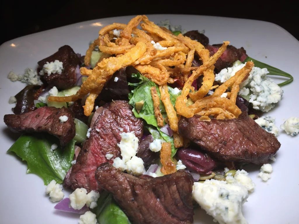 If you would like something a little on the lighter side, STACKED has some amazing salads. Here is a steak salad with mixed greens, blue cheese. and onion strings.