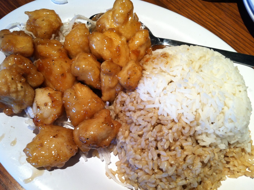 My kids are very simple when it comes to food so they chose the honey seared chicken.It had a nice sweet honey glaze and was served with those crispy rice noodles. What I love is that you can order it with half brown rice and half white rice. This way everyone is happy. For those who want to for go the rice you can substitute your rice for a garden salad for $2 more.