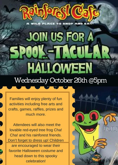 Rainforest cafe is getting into the Halloween Spirit on Wednesday, October 26th at 5 PM. Families will enjoy plenty of fun activities including free arts and crafts, games, raffles, prizes and much more.