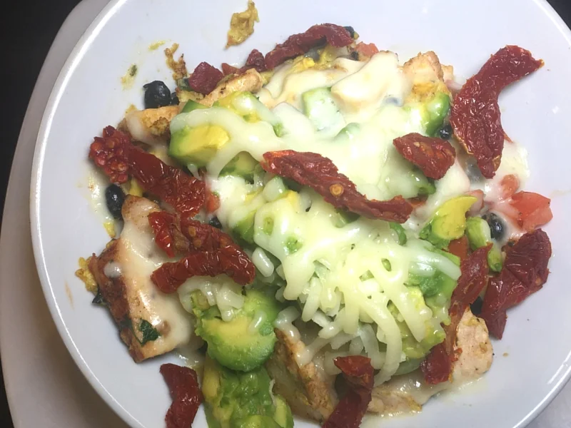 I prefered something slightly higher in protein so I got the southwestern scramble. It was packed with chicken, black beans, pico de gallo, avocado, jack cheese and I added some sun-dried tomatoes. Yum!