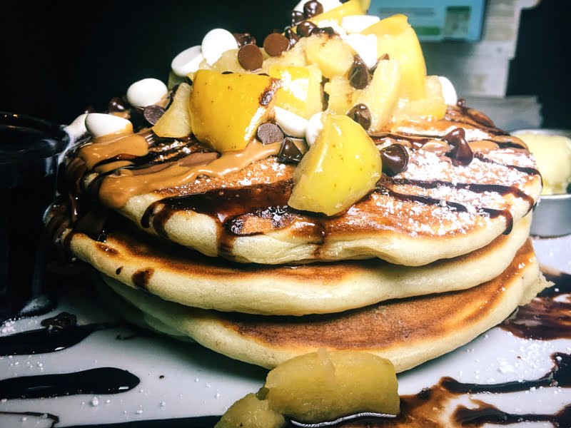 On a recent visit to breakfast there my son ordered a premium set of stacked pancakes. Don’t these look delicious? He added caramel apples, chocolate chips, Nutella and cookie butter.