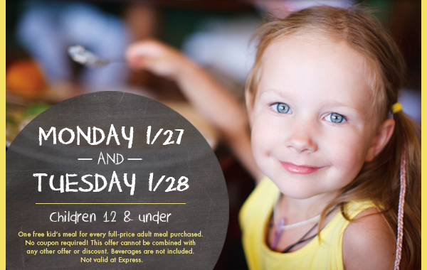 Read MoreDon’t miss out on this great deal! This coming Monday and Tuesday 1/27 and 1/28 kids 12 and under eat