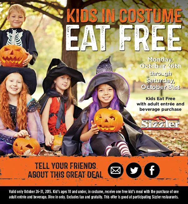 Kids in costume eat free at Sizzler October 26-31 Who doesn’t love free food? Better yet, who doesn’t love free