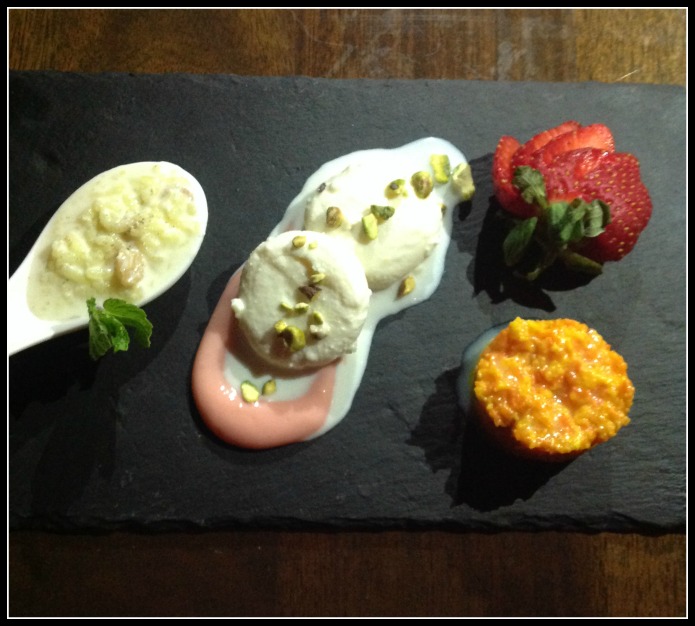 We had a small amount of room for desert, and got to try a sample plate of the rice pudding, soft paneer dumplings and carrot pudding. Our favorite was the carrot pudding for the sweetness and texture. They also offer chocolate samosas, which Dario said are especially popular (another reason for us to return).