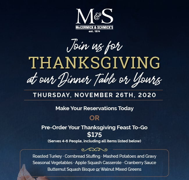 Along with the regular dinner menu, McCormick & Schmick’s will be serving a traditional turkey dinner complete with all the classic staples.