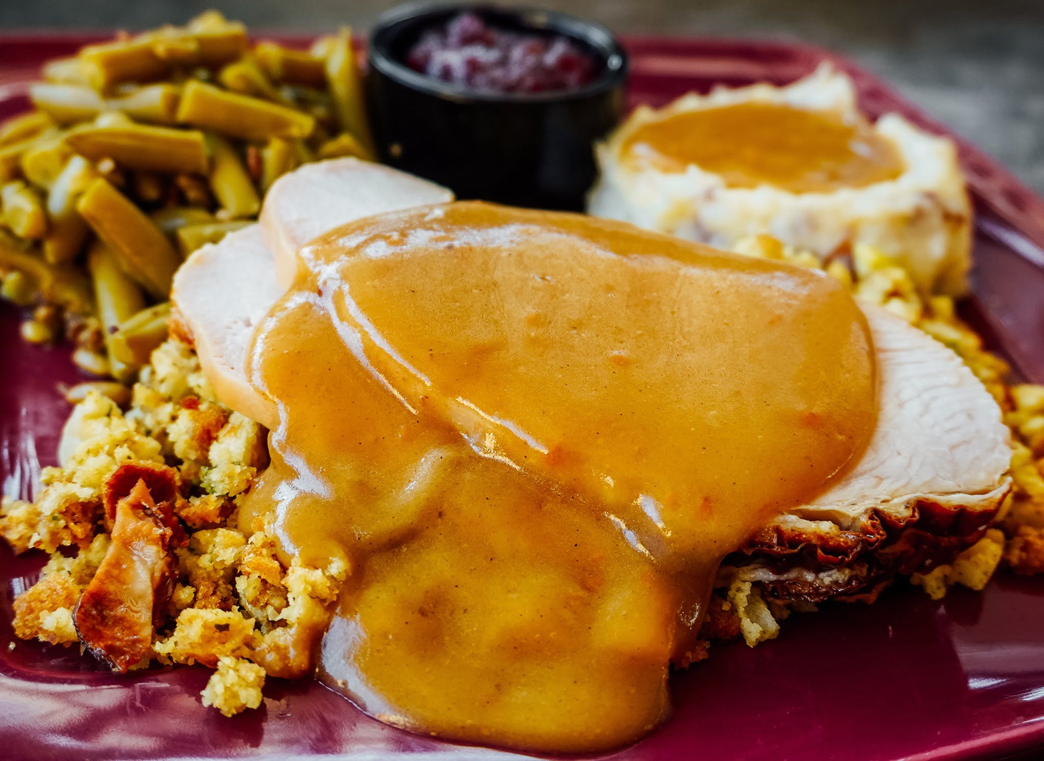 herb and butter roasted sliced turkey breat, sour cream and chive mashed potatoes, giblet gravy, cornbread stuffing, maple glazed rainbow baby carrots. house made cranberry sauce