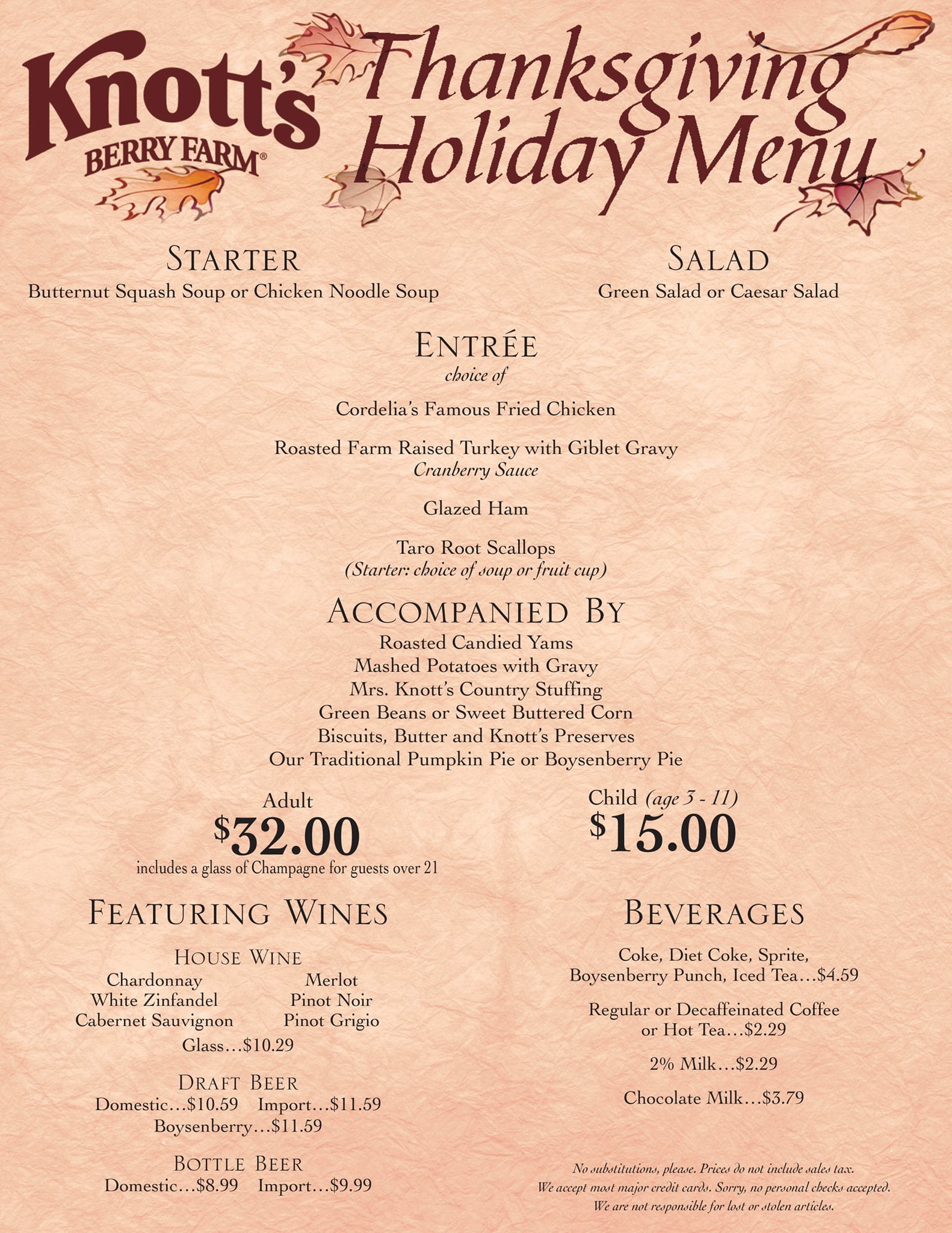 $29 per adult for Thanksgiving entrée, $15 for children 12 and under (exclusive of tax and gratuity). Á la carte menu priced per offering.
