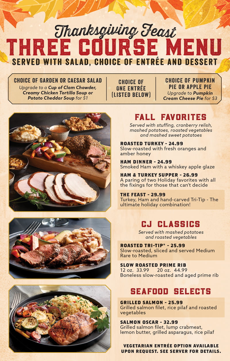 Bayside: https://www.baysiderestaurant.com/menu#menu=thanksgiving
