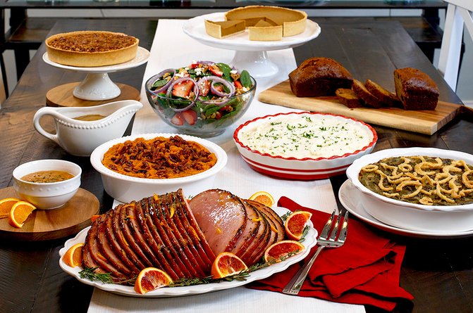 or 50 oz. sliced Glazed Ham with 1 quart Brown Gravy - 1 dozen freshly baked dinner rolls