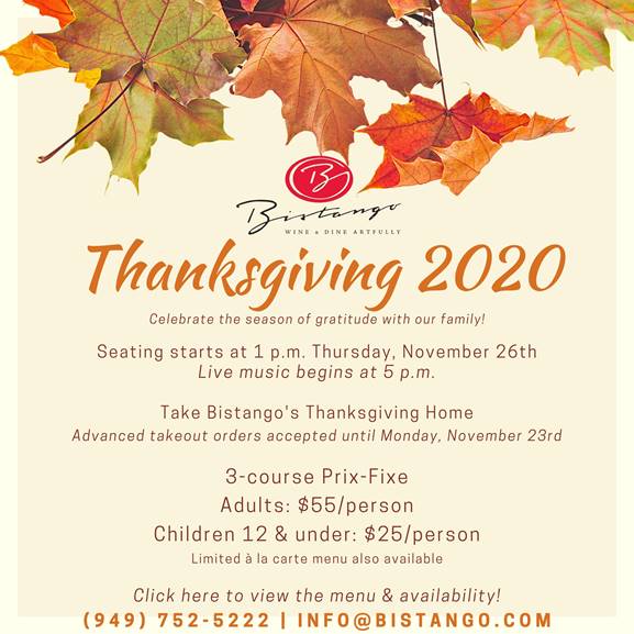 Bistango is gearing up for a socially distanced Thanksgiving along with their first-ever take-home option for the day. See below for more info, and you can check out the menus at the respective websites.