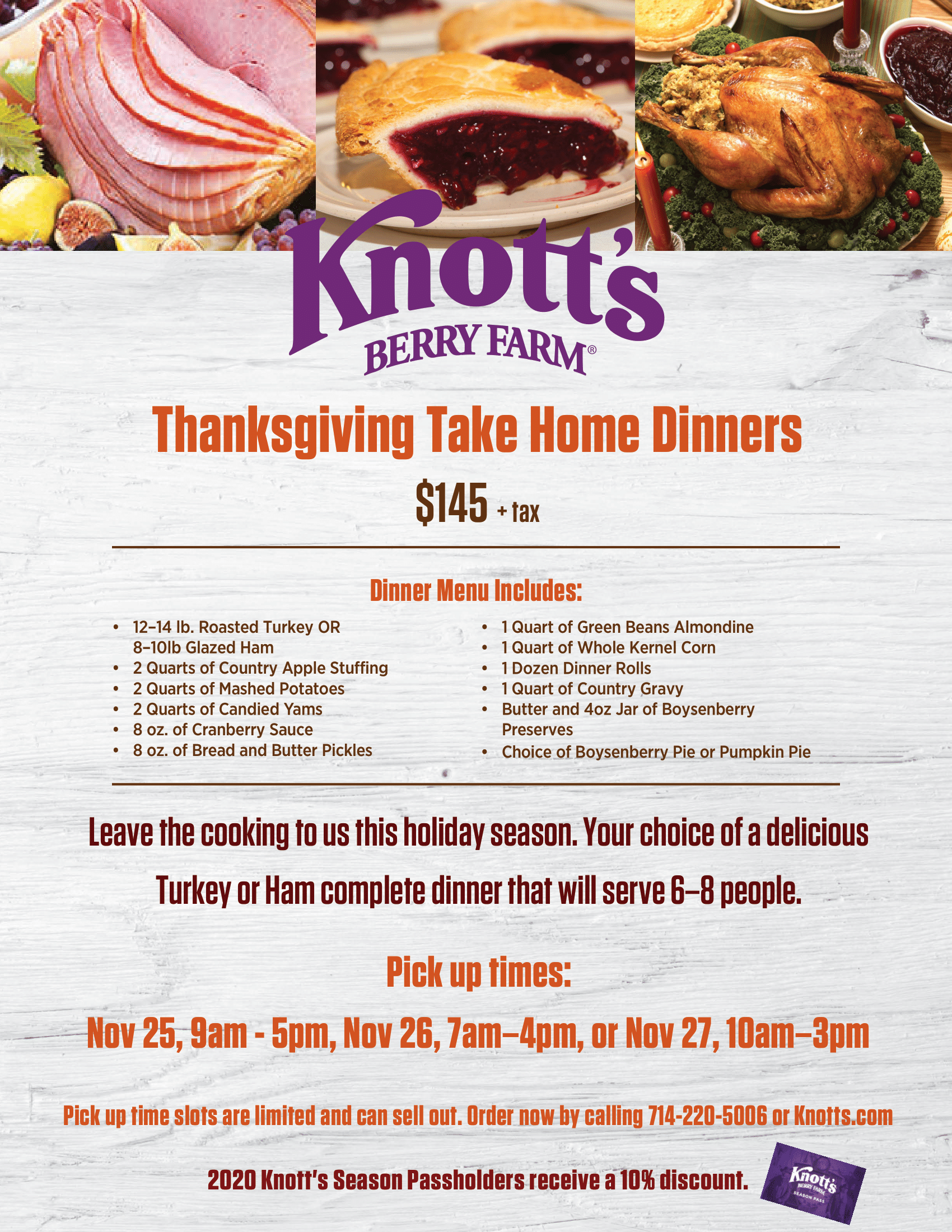 Family Feasts need to be pre-ordered and for Thanksgiving, picked up by Wednesday, November 25. Lawry’s will be closed on Thanksgiving Day.