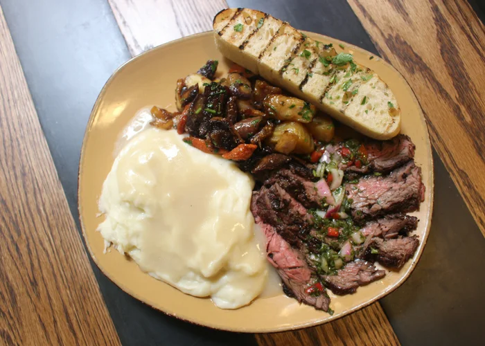 The Steak plate was also incredible. it was chimichurri grass-fed steak drizzled with an herb pesto, creamy mashed potatoes and a medley of rainbow carrots and beets.
