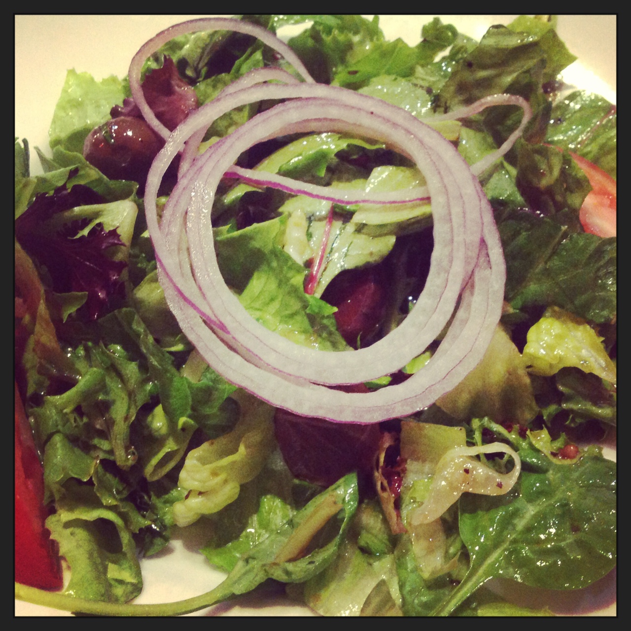 I ordered a house salad. I really enjoyed the dressing on it. It was a tangy house italian and the lettuce was a fresh mix of spring lettuce and red leaf lettuce. But one kalamata olive is such a tease.